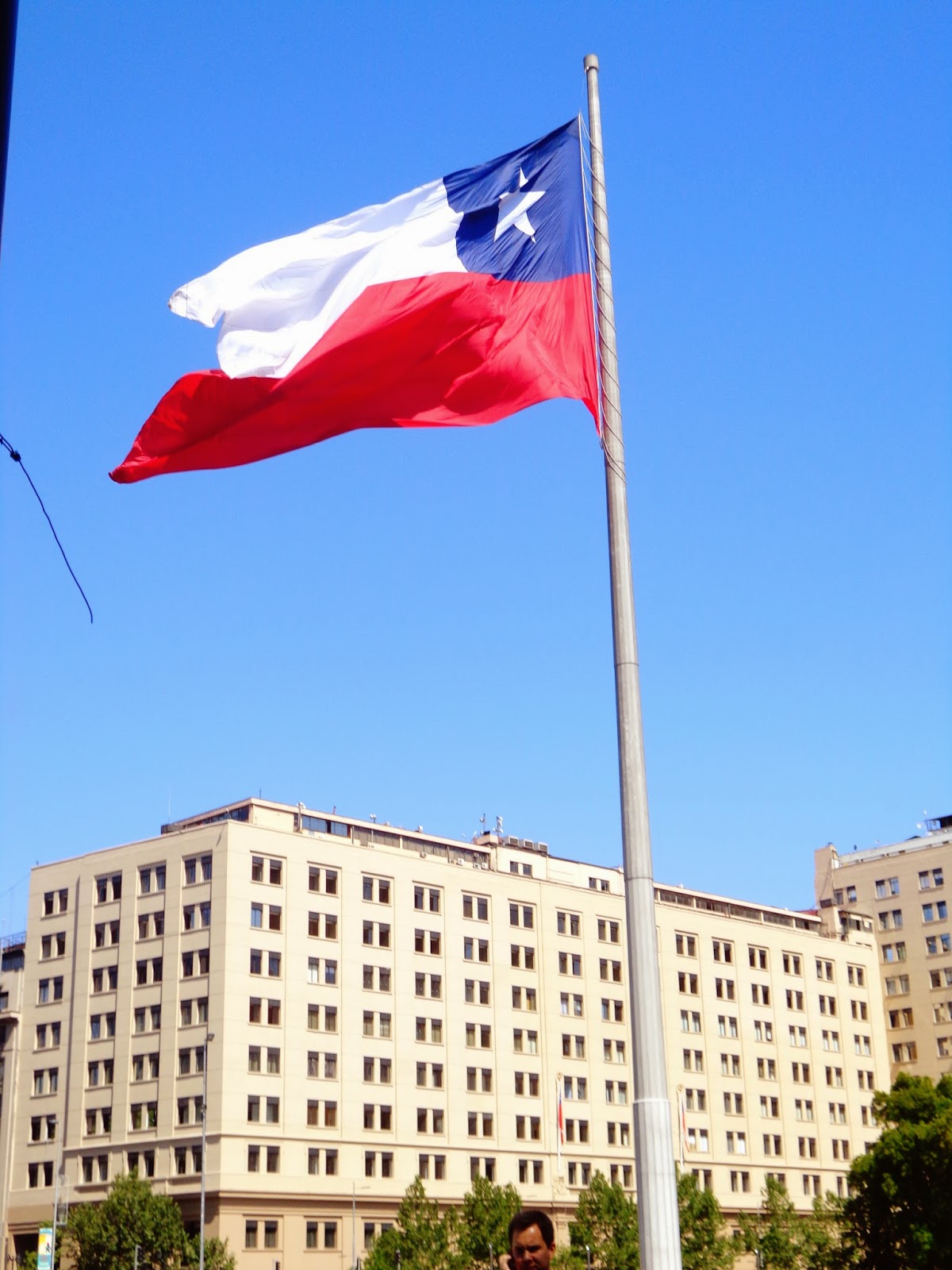 Este prédio é a sede da presidência da República e no subsolo há um centro cultural que funciona todos os dias. Em frente, próximo da Alameda, temos a bandeira do Chile bailando lindamente.