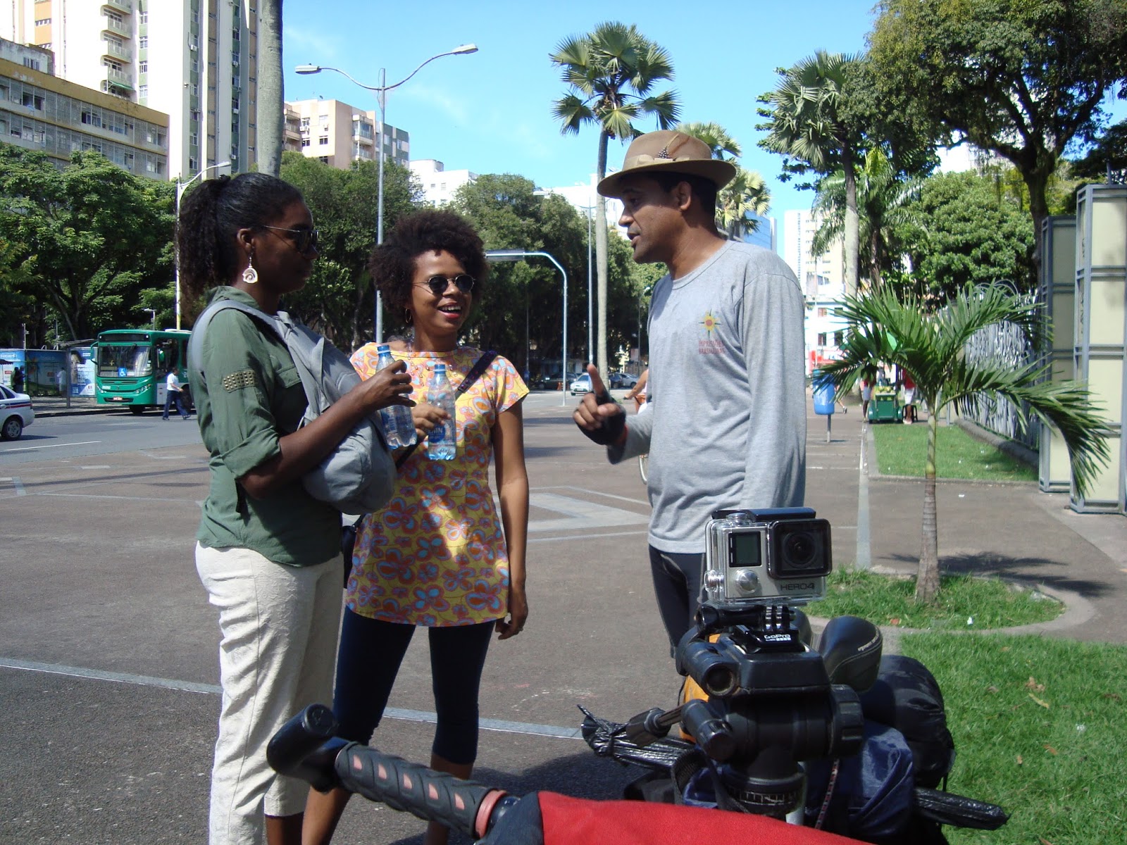 Passamos pelo Campo Grande novamente e tivemos a grata surpresa de conhecer Jota Souza, um baiano de Macaúbas que traçou um roteiro ambicioso: chegar até a Romênia. Detalhe: de bike. Algumas partes da viagem serão feitas de avião, mas ela já saiu de Macaúbas, interior da Bahia a 673km de Salvador, de bicicleta. Minha amiga perguntou onde estava a bandeira do Brasil. Ele disse que iria levar a bandeira da Bahia e já havia conseguido a bandeira da Romênia.