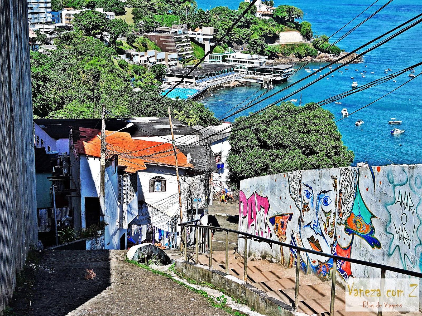 Fomos ao mirante dos Aflitos que no primeiro momento, não é atrativo e dá um certo medo, pois está pouco movimentado. Mas, durante o dia o local é frequentado por moradores da região e havia muitas crianças. Avistamos a Gamboa de Baixo e suas casinhas em cascata e a Avenida Contorno ( Av. Lafayete Coutinho). E logo abaixo do mirante tem uma boate.