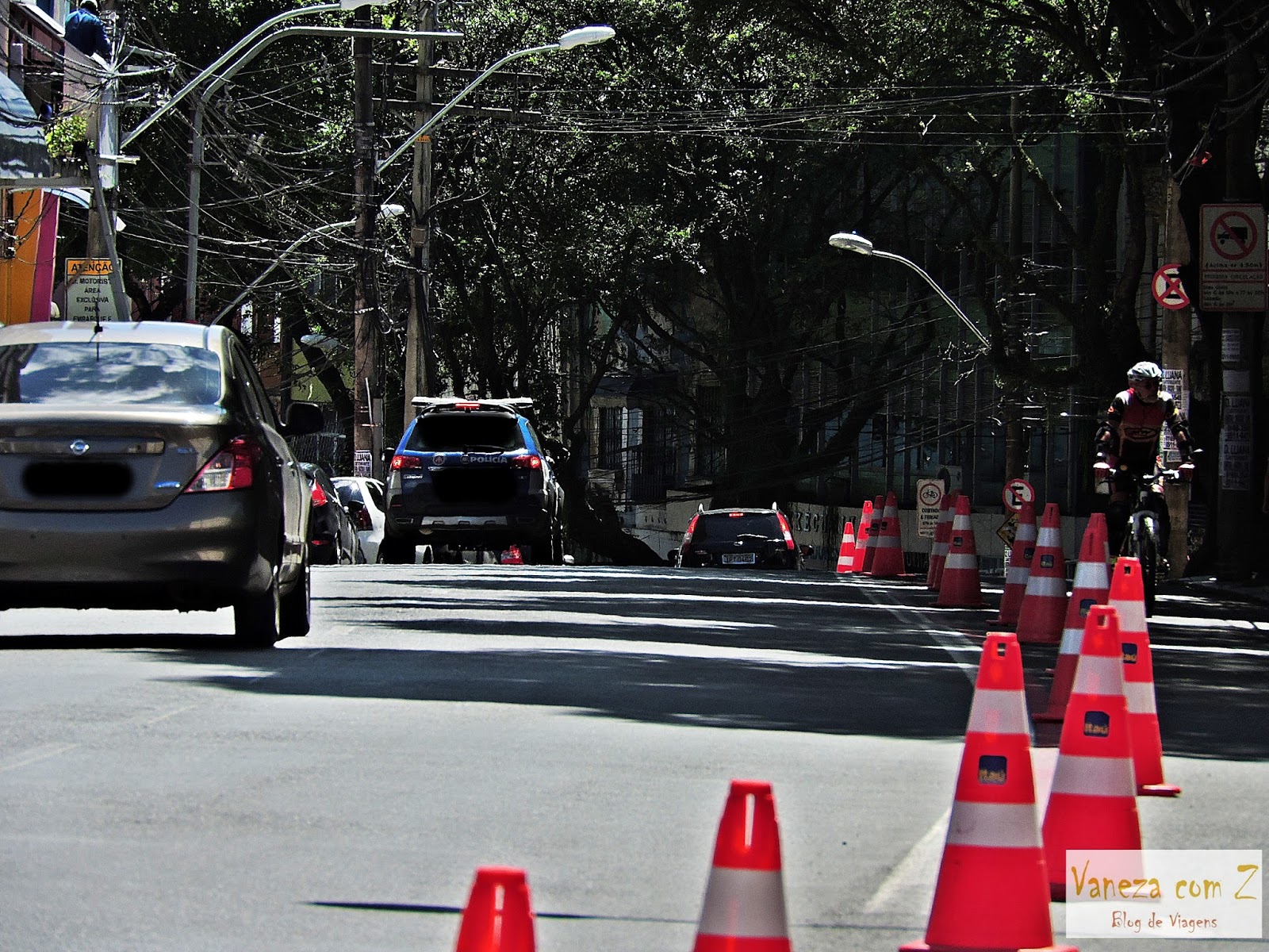 Como era domingo pela manhã, comércio fechado, trânsito tranquilo. Mas durante a semana é uma confusão e eu não aconselho a realização deste passeio. Logo depois do Colégio São Bento, uma descida em que precisamos usar os freios e ter atenção com os pedestre.