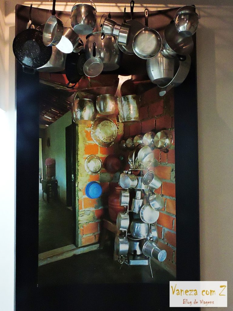 os utensílios: as panelas, as colheres, os pratos e muitos outros equipamentos usados na arte de cozinhar e preparar o alimento , estão dispostos de maneira criativa e inusitada.