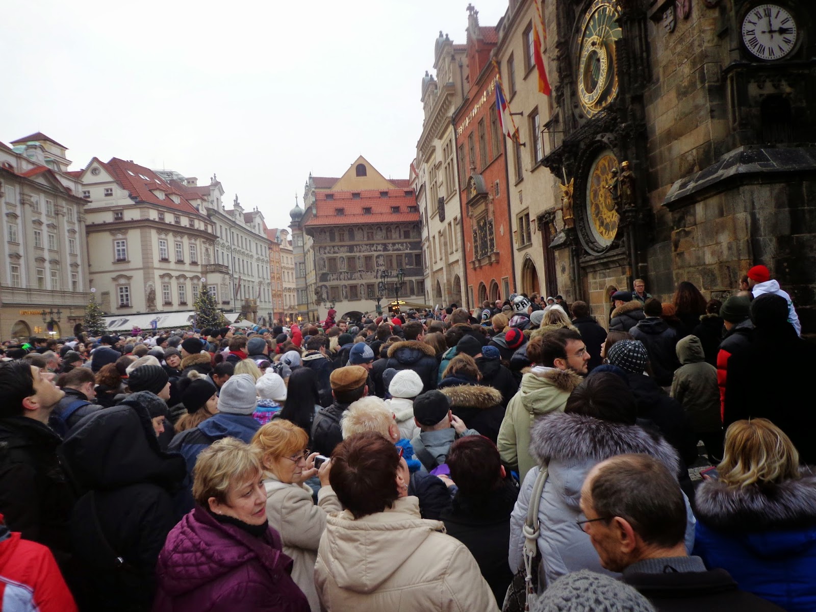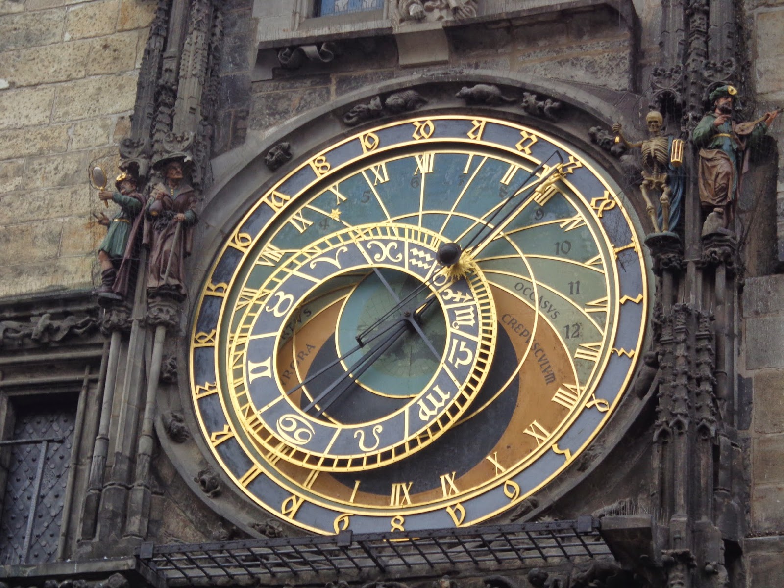 Ah! Tem mais coisas, as horas são dadas em um espetáculo em que sai os símbolos que os praguenses mais temiam: o Avarento, o Vaidoso, a Morte e o Turco. Além dos doze apóstolos que saem das janelas acima do mostrador. Isso ocorre a cada hora cheia das oito da manhã as oito da noite. Quando cheguei não era hora do espetáculo, mas todo mundo fica na expectativa olhando pro relógio.