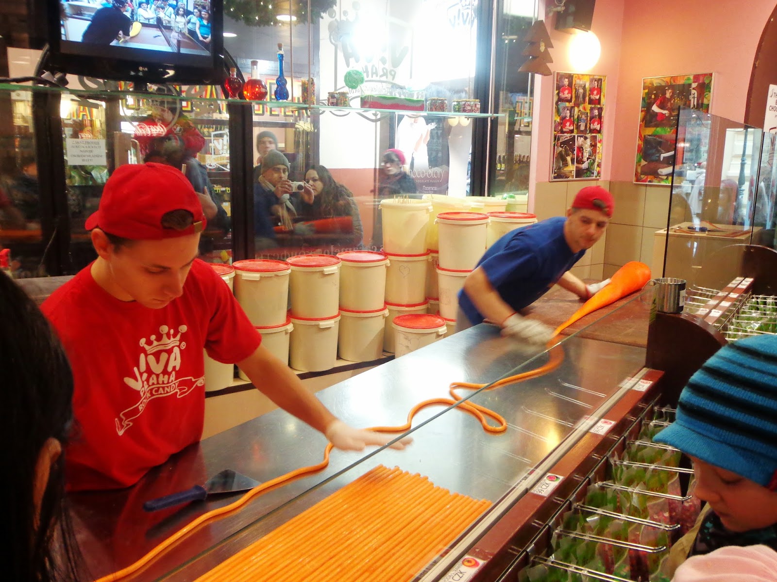 Nesta rua, encontrei uma loja de chocolates belgas que me deixou louca. O nome é Viva Praha. É bem turística, mas a variedade de guloseimas é incrível. Uma grande atração na loja é a produção de balas coloridas que é feita ao vivo onde dois funcionários esticam a massa e com uma espátula simplesmente cortam e a massa endurece rapidamente. As crianças não piscam o olho assistindo isso.