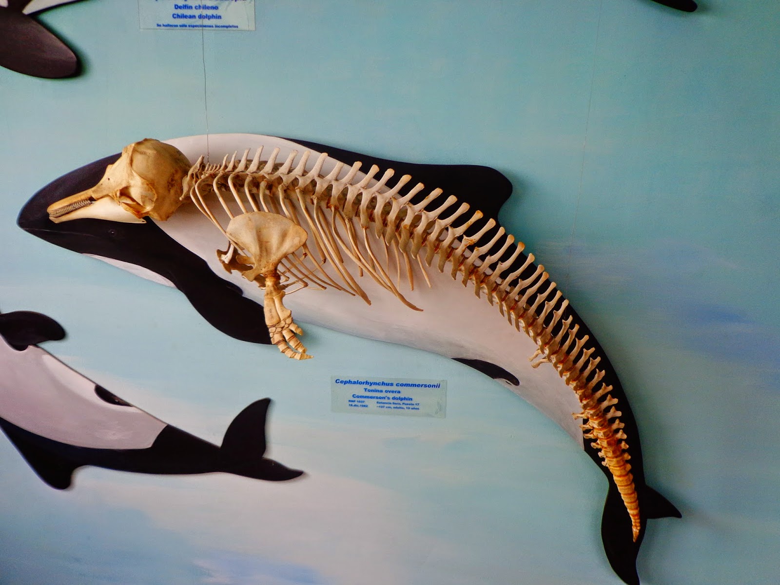 Seguimos a pé para o Museu Acatushun que exibe o esqueleto de aves e mamíferos da região austral. Este Museu foi idealizado por Rae Natalie Prosser Goodall, uma americana que em viagem ao sul da América conheceu Thomas Goodall, sobrinho e neto do fundador da Estância. Somos recebidos por dois guias para explicações em inglês e espanhol. O que me chamou atenção foi o esqueleto do golfinho da espécie tonina overa que eu havia visto no Estreito de Magalhães e relatei aqui a experiência.
